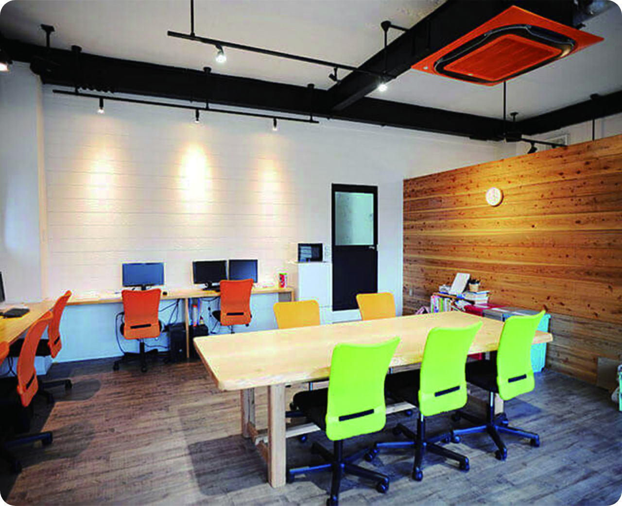 一軒家をリノベーションしたオフィスは、木とオレンジを基調とした温かみのある空間。室内には音楽が流れ、リラックスしながら集中して作業できる環境を整えています。